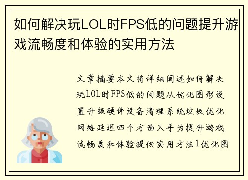 如何解决玩LOL时FPS低的问题提升游戏流畅度和体验的实用方法