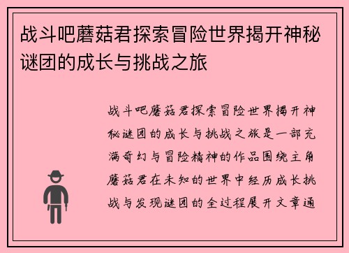 战斗吧蘑菇君探索冒险世界揭开神秘谜团的成长与挑战之旅